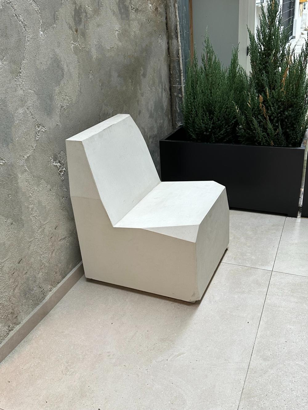 Ligne de mobilier néo-brutaliste, utilisant des formes parallélépipédiques minimalistes, avec des faces angulaires et des arêtes coupées par des plans obliques concurrents.
