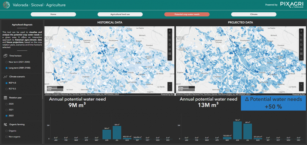 Dans Valorada, nous produisons des portraits de territoires (ruraux et urbains) interactifs sous 3 thématiques : trame verte, climatologie, occupation des sols. Pour chacune, nous analysons l'année en cours et la projection à moyen terme grâce à des indicateurs clés. Valorada permet aux politiques publiques de quantifier les impacts et prendre des décisions d'adaptation, éclairées et ciblées.